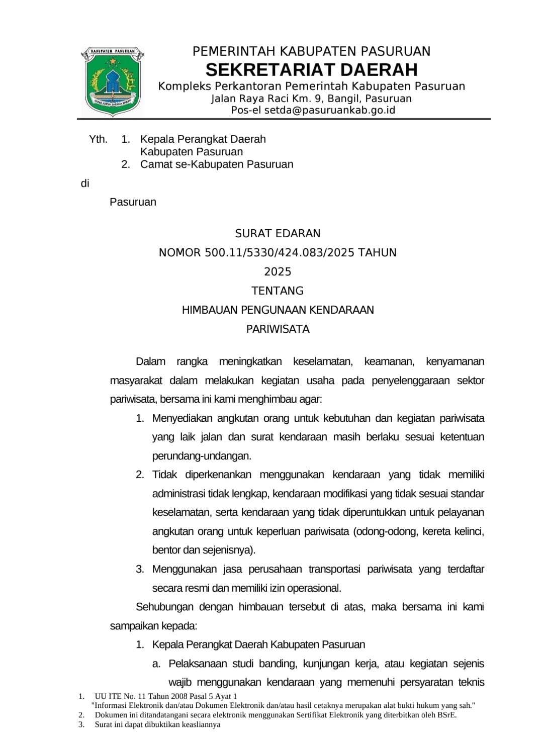 Pasuruan Mediasi86.com, Sekretaris Daerah Kabupaten Pasuruan Mengeluarkan Surat Edaran nomor 500.11/5330/424.083/2025 tahun 2025 tentang Himbauan Penggunaan Kendaraan Pariwisata, demi meningkatkan Keselamatan, Keamanan dan Kenyamanan Masyarakat dalam melakukan kegiatan usaha pada penyelengara di sektor Pariwisata.